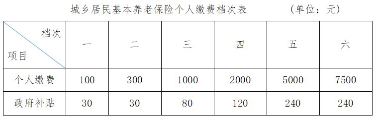 从2020年起,城乡居民基本养老保险个人缴费档次调整为六档,年缴费标准见下表: