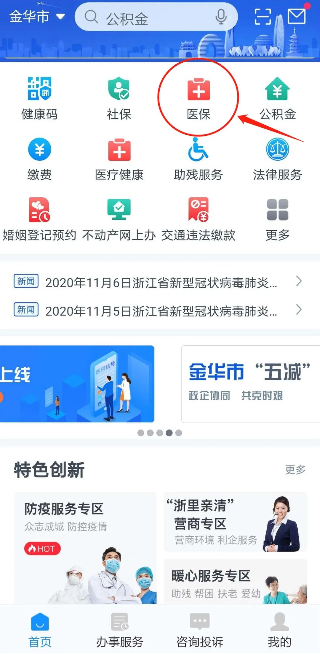 第一步:打开浙里办,定位金华,金华市本级,搜索框内搜索“医疗保障”,点击“医疗保障”或在界面上直接点击 “医保”