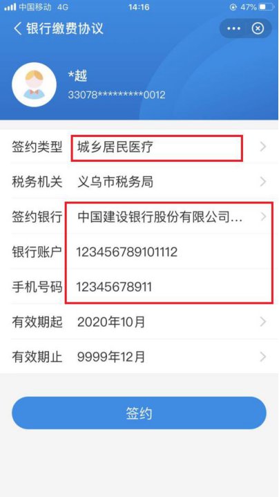 选择“签约类型”“签约银行”,填写“银行账户”“手机号码”,点击“签约”