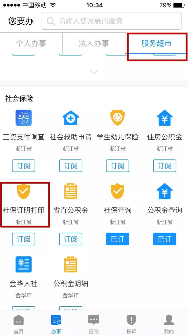 第三步:点击“服务超市”,下拉至社会保险里的“社保证明打印”选项,点击进入。