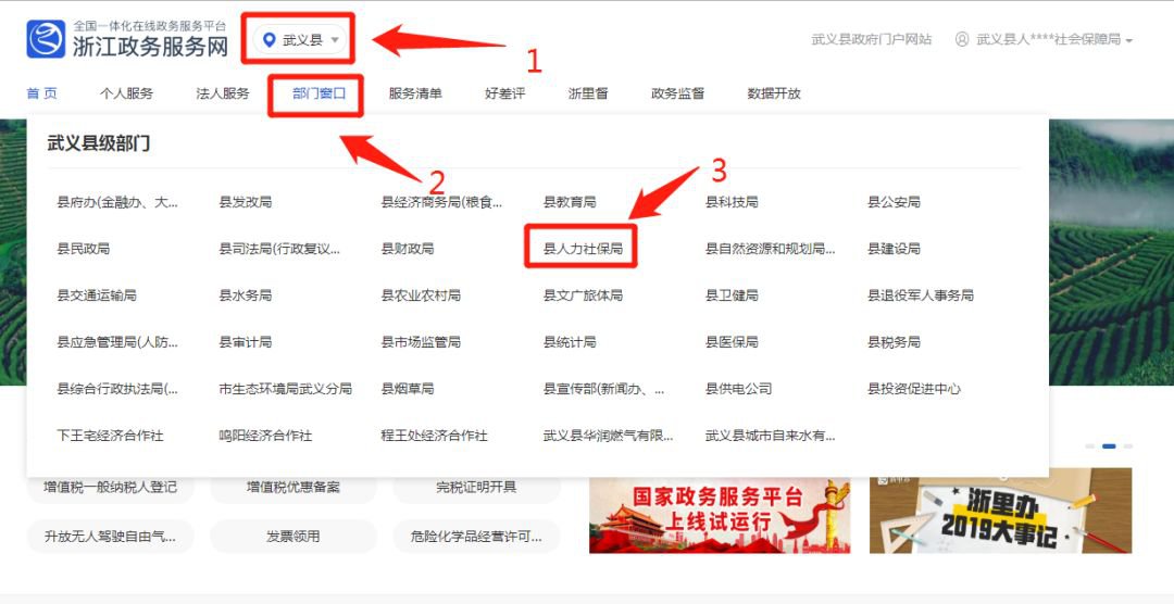 第一步:打开浙江政务服务网,法人登录后定位到企业所在的地区(此处以武义县为例),选择部门窗口中的县人力社保局,点击进入