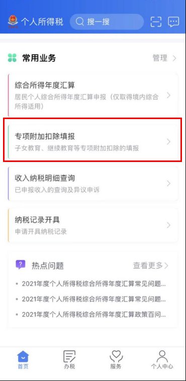 纳税人登录手机个人所得税APP后,可通过“首页——常用业务——专项附加扣除填报”或“办税——专项附加扣除填报”进入专项附加扣除填报界面,并选择“婴幼儿照护费用”专项附加扣除。