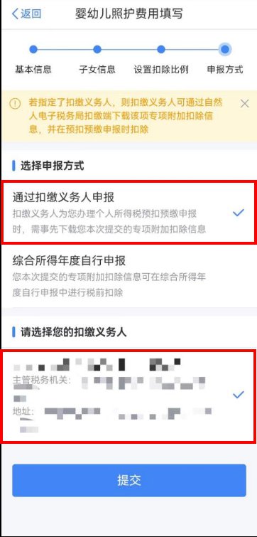 设置扣除比例后,进入“申报方式”界面,纳税人可根据实际情况选择“通过扣缴义务人申报”或“综合所得年度自行申报”任意一种方式。如果纳税人需要在每月发放工资薪金时享受专项附加扣除,需要选择“通过扣缴义务人申报”,并核实扣缴义务人信息是否准确。选择完成后,点击“提交”,即完成3岁以下婴幼儿照护专项附加扣除填报流程,系统将弹出“专项附加扣除信息已提交”的提示。纳税人可以点击“查看填报记录”查看已经申报的专项附加扣除信息。