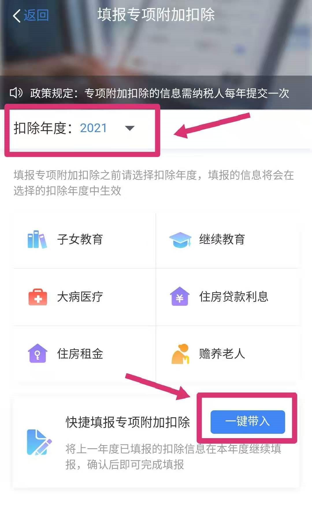 2021年度的专项附加扣除仍为子女教育、大病医疗、继续教育、住房贷款利息、住房租金、赡养老人6项。纳税人可根据个人实际情况分项填报,如果扣除项目无变化,也可选择快捷操作。