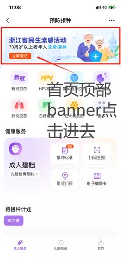 民生流感预约入口:首页有两个方法可以进入预约,第一个是【流感疫苗】进入流感专区后点击最上方的【民生流感活动立即登记】;第二个是【成人疫苗】首页的【顶部广告】进入流感专区,如图: