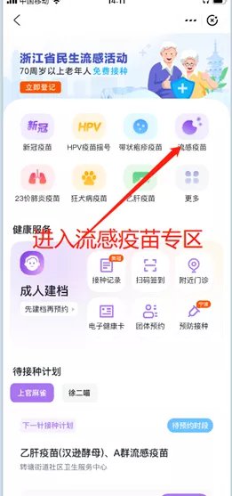 民生流感预约入口:首页有两个方法可以进入预约,第一个是【流感疫苗】进入流感专区后点击最上方的【民生流感活动立即登记】;第二个是【成人疫苗】首页的【顶部广告】进入流感专区,如图: