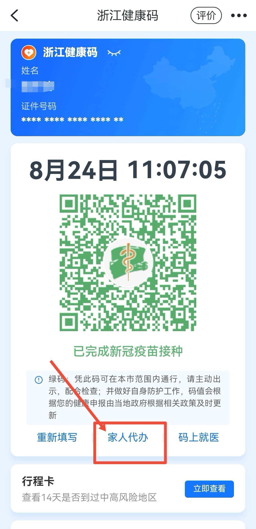 您可在申请的健康码下方,点击家人代办,输入相关信息后办理,具体请以实际页面显示为准。