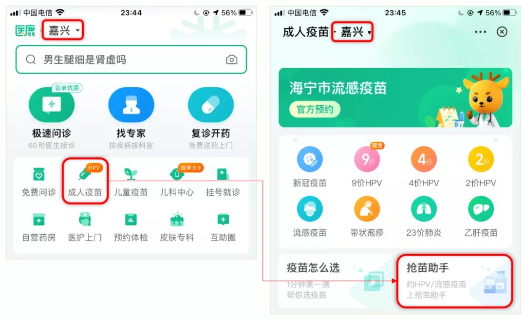 2、选择“嘉兴”地区,点击医鹿App首页“成人疫苗” ,进入页面后再点击“抢苗助手”。