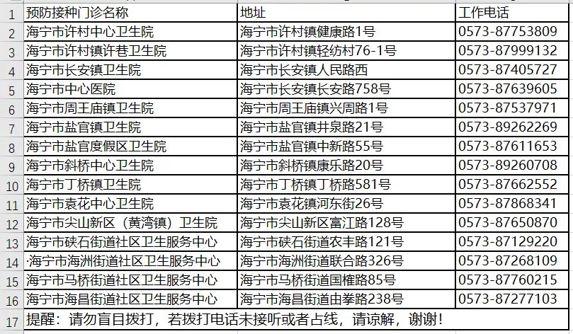 海宁市9价HPV疫苗预防接种门诊一览表: