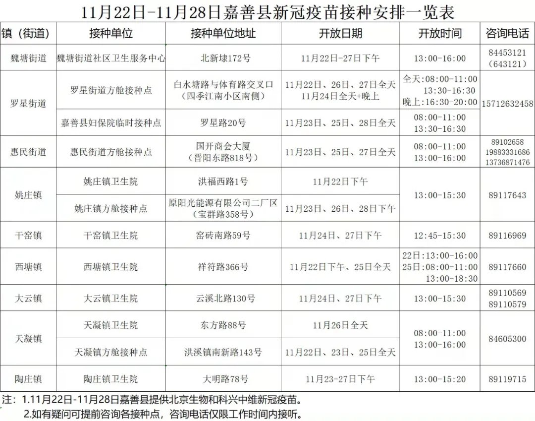 嘉善县新冠病毒疫苗接种安排一览表(11.22—11.28)