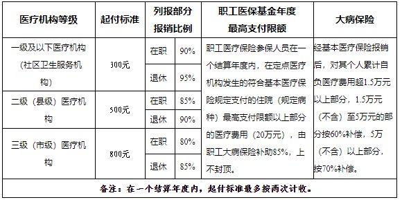 ➤职工基本医疗保险参保人员在当年个人账户资金用完后,符合职工基本医疗保险支付范围的门诊医疗费用在6000元以内部分,在职职工自费500元、退休人员自费300元后,由统筹基金给予50%的补助。