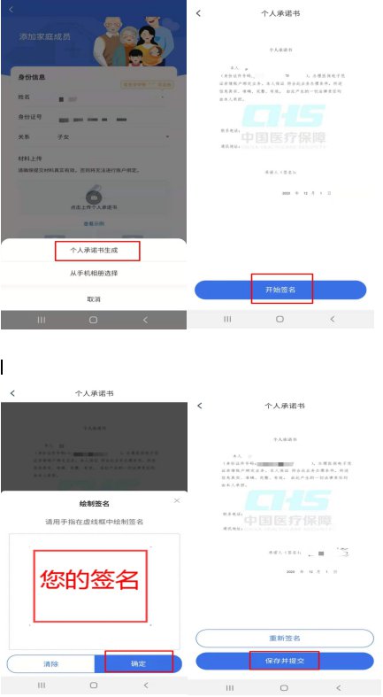 签订“家庭成员添加告知书”后,输入家庭成员的姓名、身份证号码、关系,并上传指定材料。