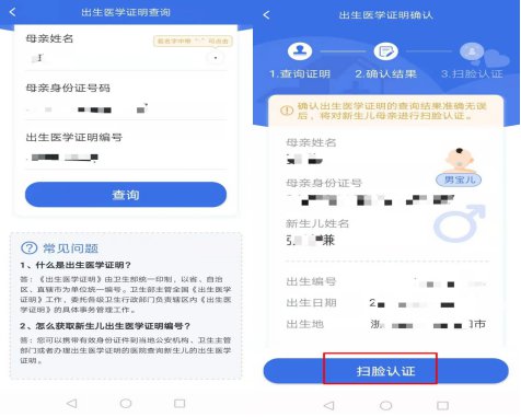在确认信息无误后点击【扫脸认证】按钮,对新生儿的母亲进行人脸识别,人脸识别成功后即可完成绑定。