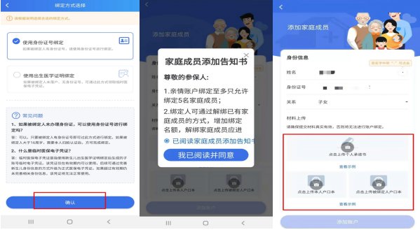 ②上传本人户口本(常住人口登记卡)、被绑定人户口本(常住人口登记卡),点击“添加账户”即可绑定成功。