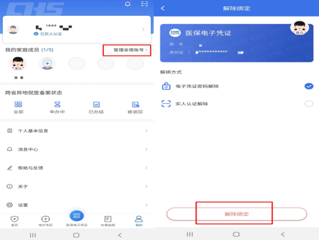 那么医保电子凭证“亲情账户”如何解除绑定?在个人中心页面的【我的家庭成员】板块,点击右上角的【管理亲情账户】,可以看到您关联的所有亲情账户。