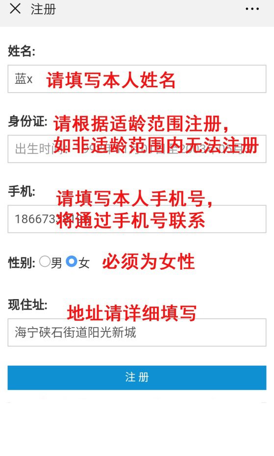 二、注册:进入注册预约页面,注册后可以在预约时间段内进行预约。(一个微信号只能注册一次,同时既往预约成功的不再接受预约。)