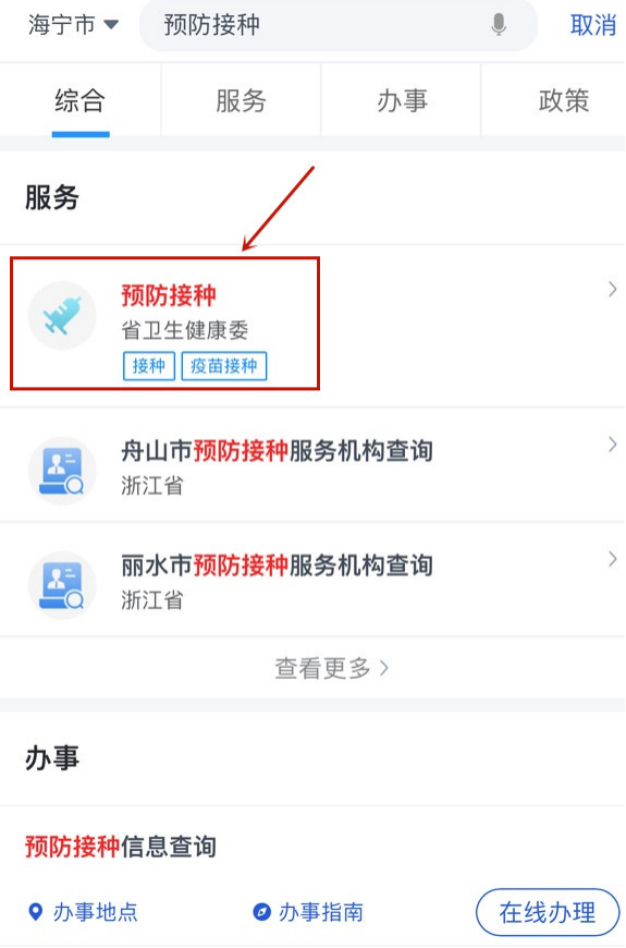 步骤一:打开浙里办APP,搜索预防接种,点击“预防接种”应用。