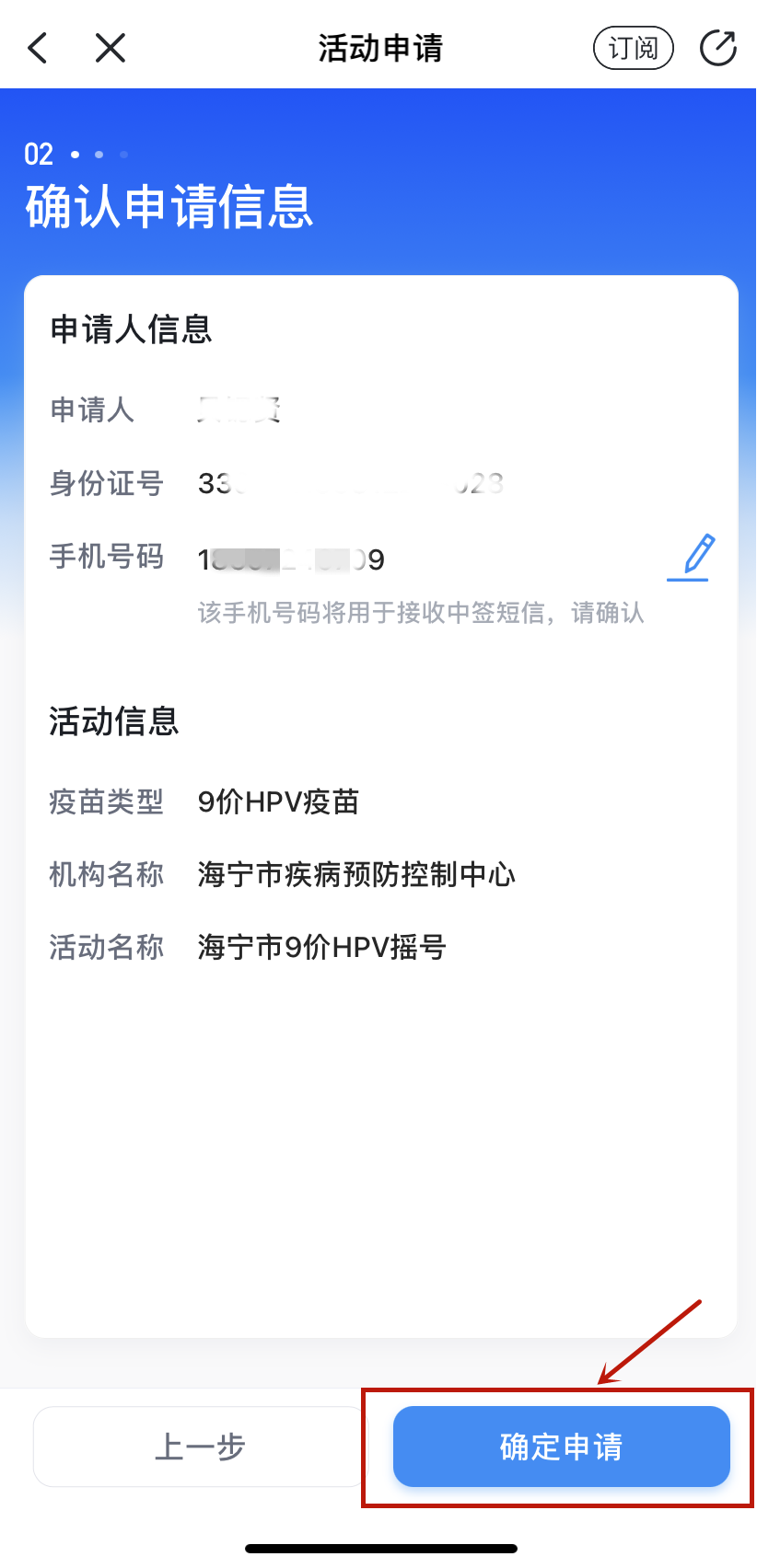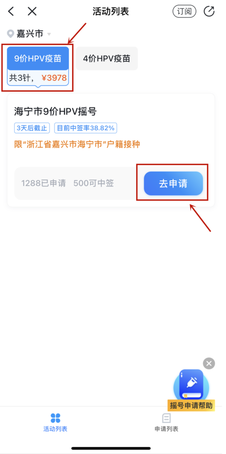 步骤二:进入预防接种页面后,点击“HPV疫苗”,左上角地区切换成“嘉兴市”,选择“9价HPV疫苗”,找到活动后点击“去申请”。