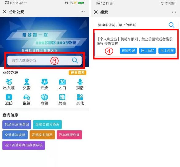 (3)登录后,在③位置搜索“机动车限制、禁止的区域或者路段通行 停靠审核”,找到④事项选择在线办理