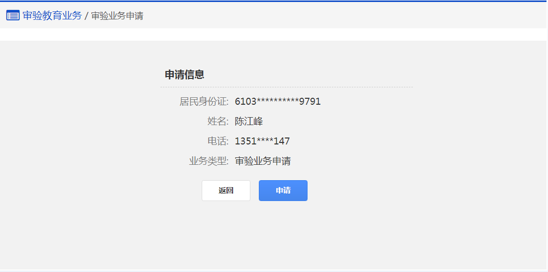 在该步骤,确认无误后点击"申请",审验业务申请提交成功。