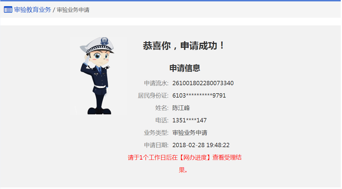 (2)受理结果将发送短信告知(请确认您申请时手机号可以接收到短信),若您收到“尊敬的XXX,您于XXXX-XX-XX通过互联网综合服务平台提交的审验业务申请已办理成功。”等字样的短息代表已办理成功。