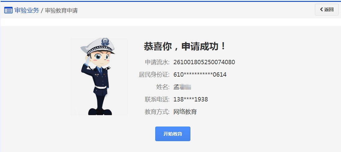 (4)完成审验教育后,若未选择“完成教育后自动办理审验业务”,请及时办理审验业务。 若已选择,系统将自动为您办理审验业务申请,请您在网办进度中关注受理进度,受理结果将以短信告知。
