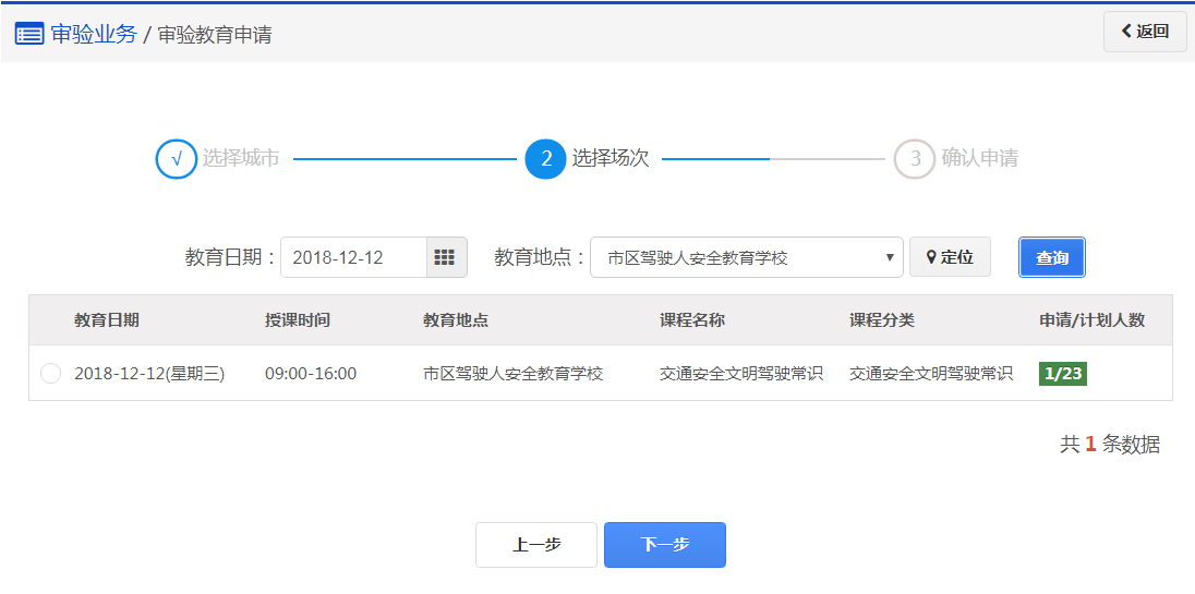 在该步骤,用户选择日期、场地,点击【查询】。可以点击定位按钮查看教育地点定位。 在查询结果列表中选择一个未预约满的教育场次。用户选择教育场次信息后,点击【下一步】,进入步骤4:【确认申请】。