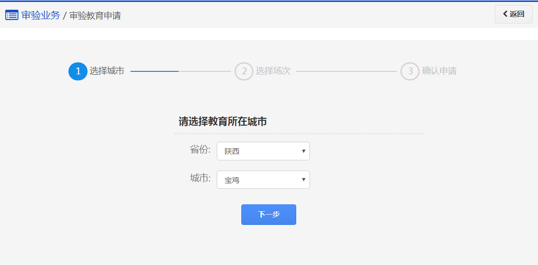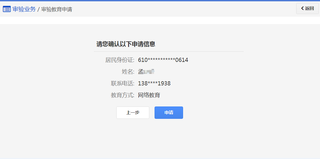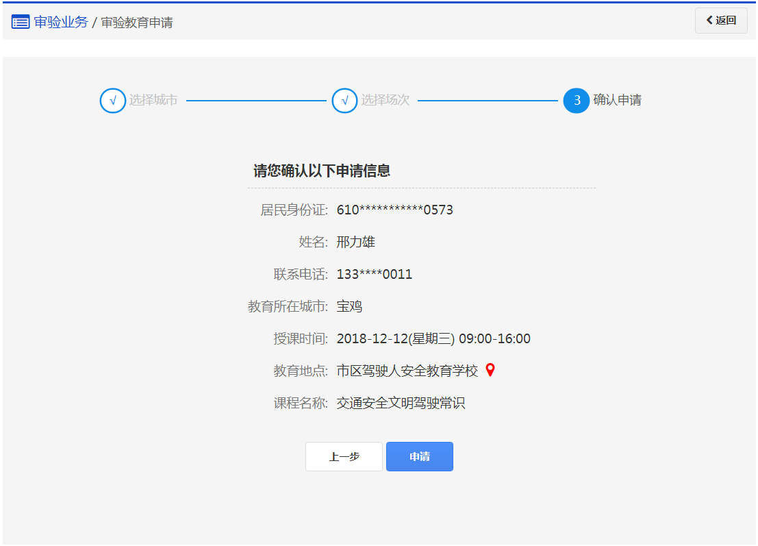 在该步骤,用户审验现场教育已申请成功,请在规定的时间内参加相应的教育场次完成审验教育。
