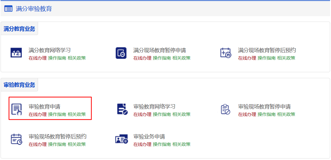 用户通过该功能可以申请 网络教育 或 现场教育 方式来完成审验教育。