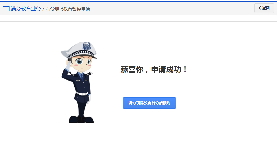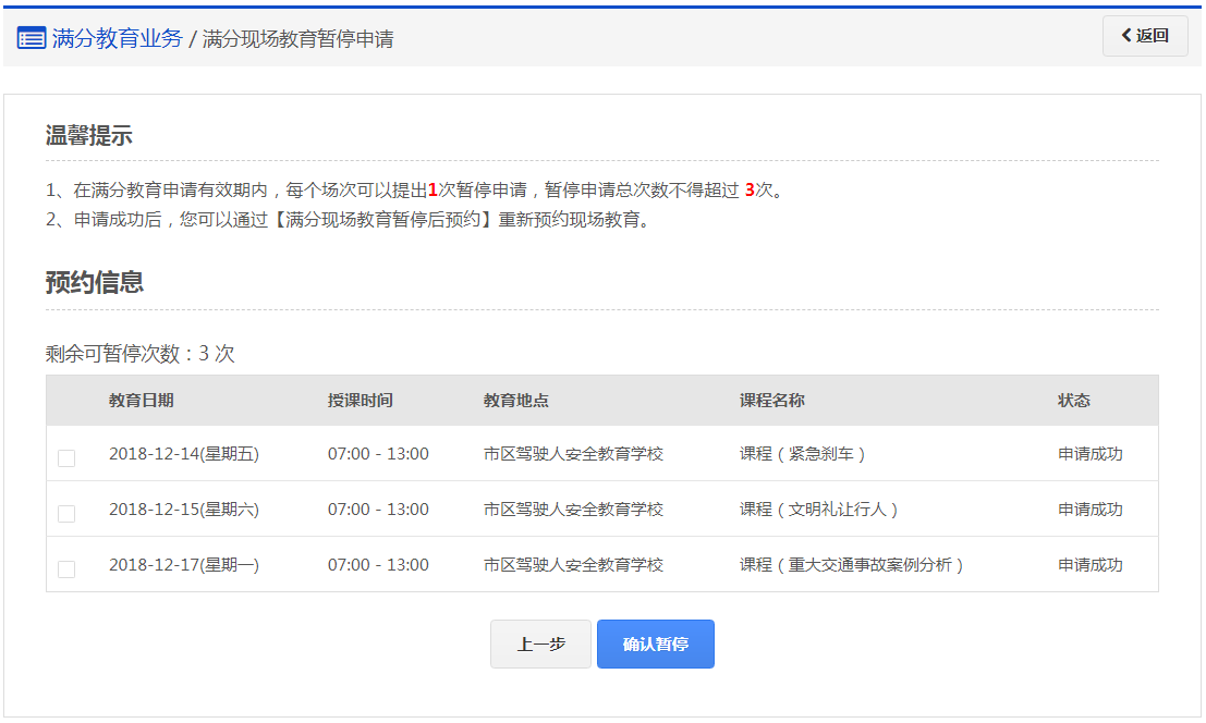 (1)在满分教育申请有效期内,需根据预约的现场教育日期提前一日办理,已过教育日期的场次无法暂停。