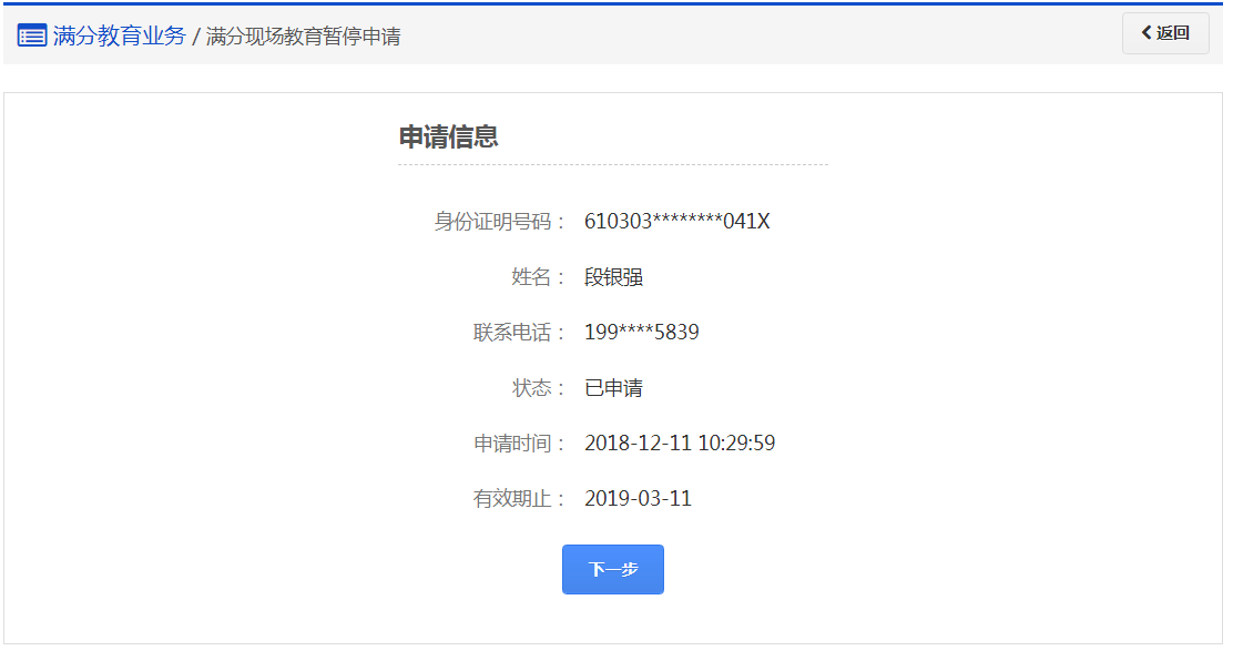 点击【满分现场教育暂停申请】,进入步骤1:【预约满分申请】。查看我的申请信息,点击“下一步”后进入步骤2。