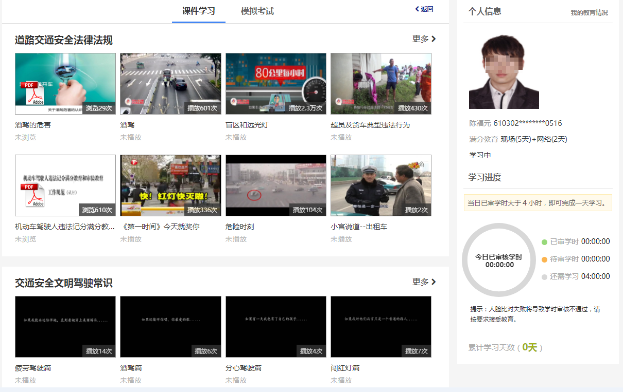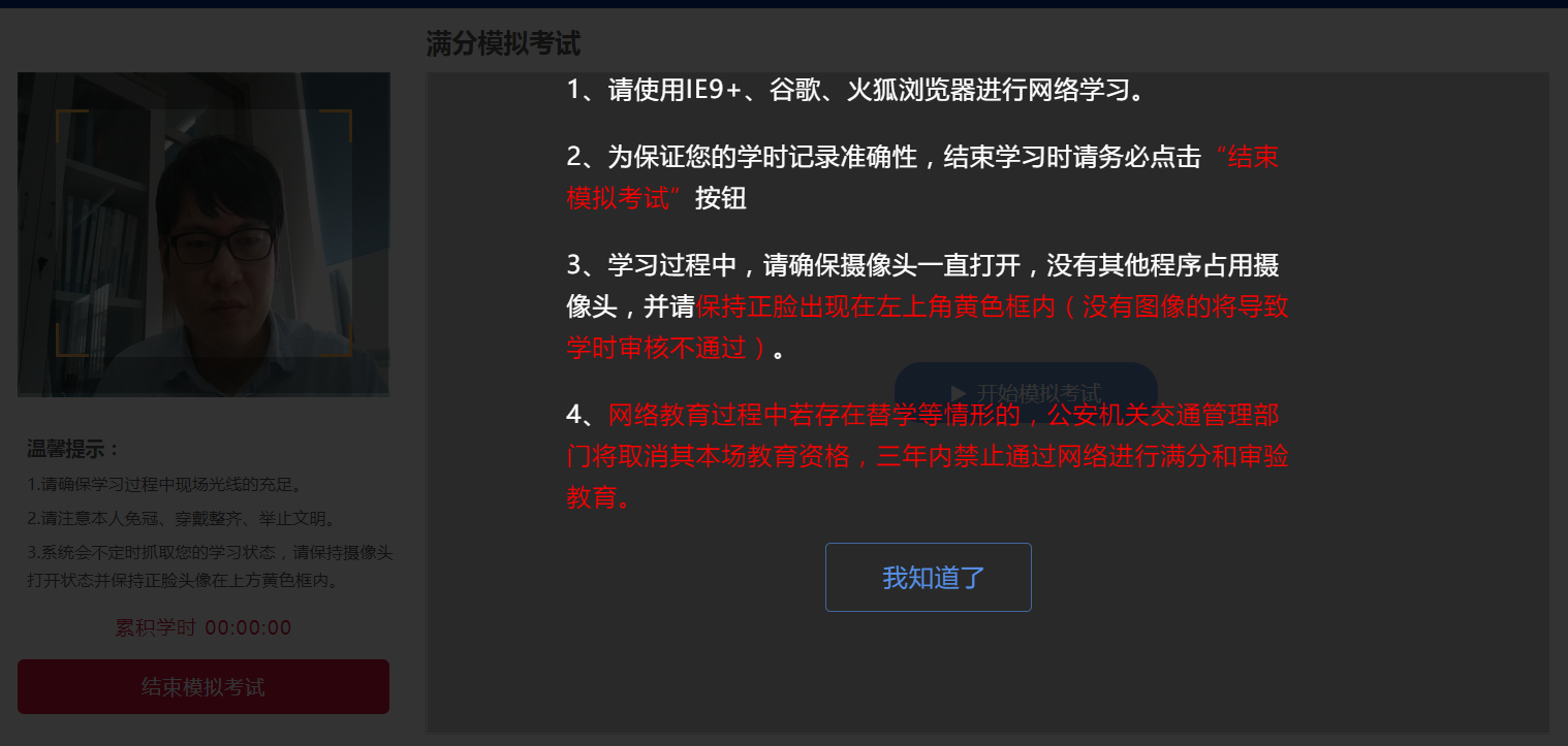 满分网络学习形式包括 视频课件、文档课件、满分模拟考试。学习过程中必须打开摄像头,系统不定时抓拍学习照片, 有异常情形的系统记录嫌疑。当天累计学满 3小时 ,由管理员审核通过后,视为当天教育完成。7天满分教育完成后即可办理预约满分考试。