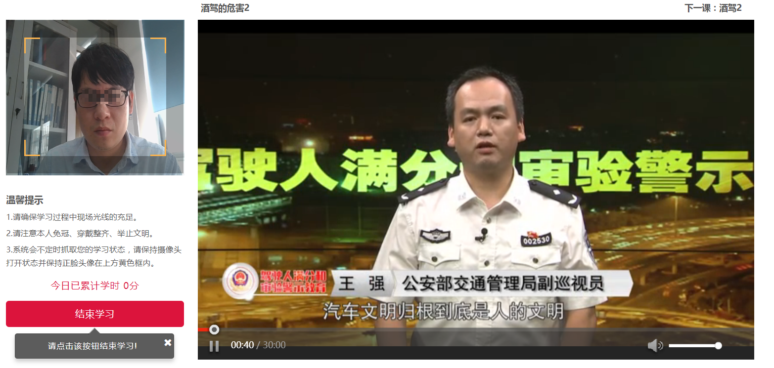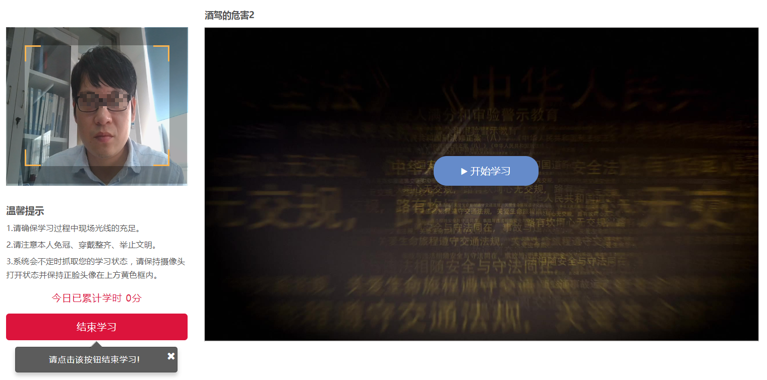 (4)系统将累积您当天的学习时间,若您中途有事离开或者暂时结束学习,请点击“结束学习”按钮。否则若系统抓拍到您未在电脑前学习,将导致当前学习记录审核不通过。