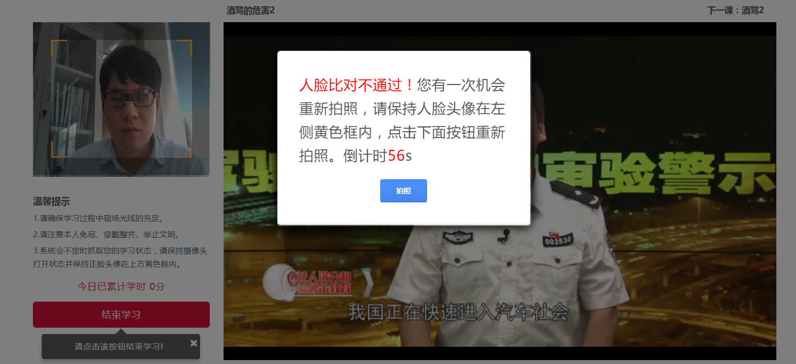 学习过程中,请确保您的人脸图像出现在左上角黄色框中间,清晰可辨。系统将不定时随机抓拍学习照片进行人脸比对,请将人脸正对摄像头,如下图所示。人脸比对不通过时,系统弹出提示框要求用户再次提交学习照片, 此时,请保持人脸头像出现在左上角黄色框内,并在60s内点击【拍照】,人脸比对仍不通过的将记录嫌疑。
