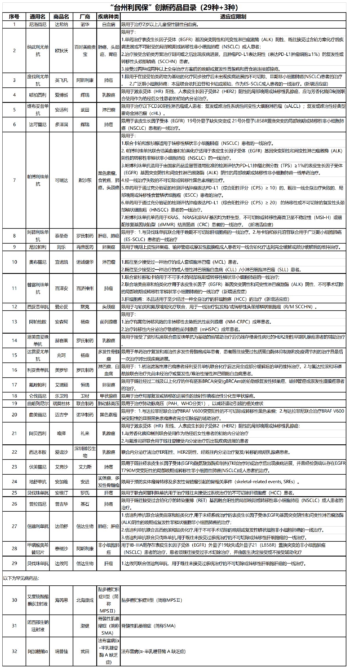 《台州利民保创新药品目录(29种+3种)》