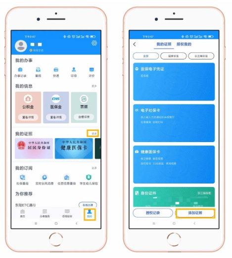 进入“浙里办”APP首页点击“我的”,选择“我的证照”-“更多”,点击“添加证照”