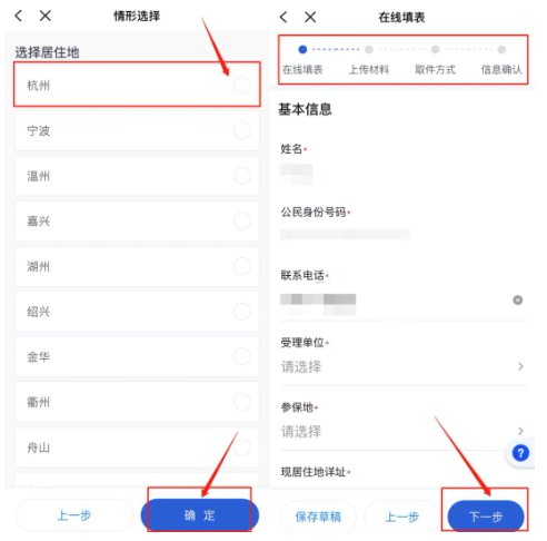 通过身份验证后,选择居住地所在市、县(市、区),选择居住证申领类型,依次按照“告知承诺—在线填表—上传材料—确认提交”,完成申请流程。