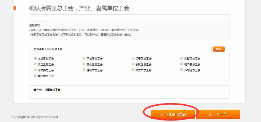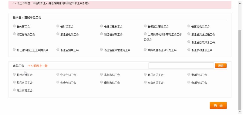 第二步:选择上级工会。首次进入补助申领系统的职工,需要选择职工本人单位所属的市总工会或省产业(局)工会。