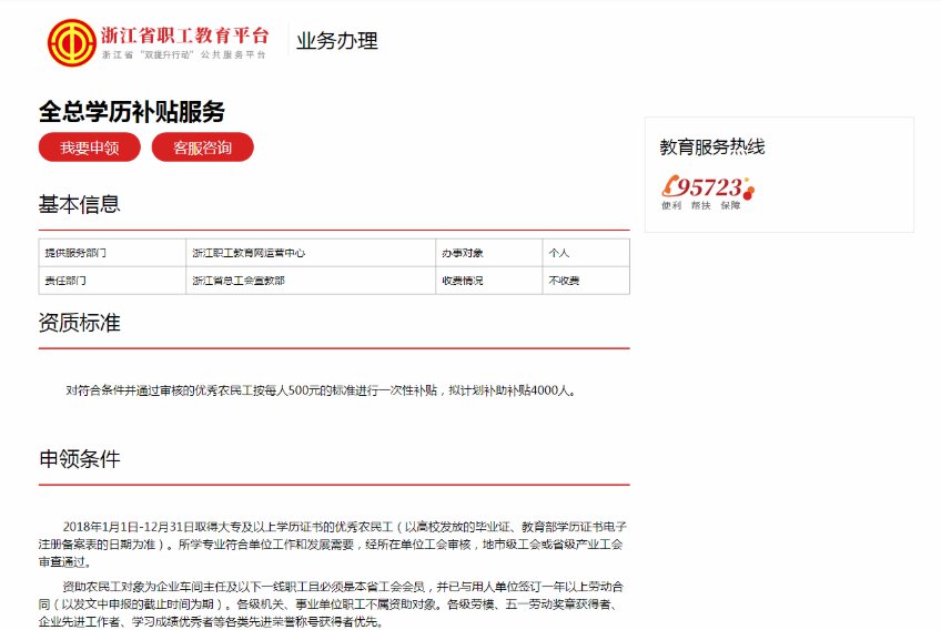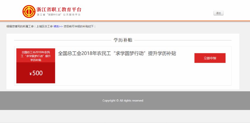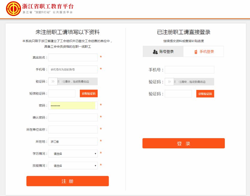 第一步:注册登录。符合条件的职工本人登录浙江网上职工之家(www.zjftu.org)——“职工教育”模块“浙江省职工教育平台”,查看“服务办理”栏目——工会补助申领服务——点击“全总学历补助申领”——“我要申领”。未注册账号职工在网页左侧填写注册资料完成注册;已注册账号职工在右侧登录申请。