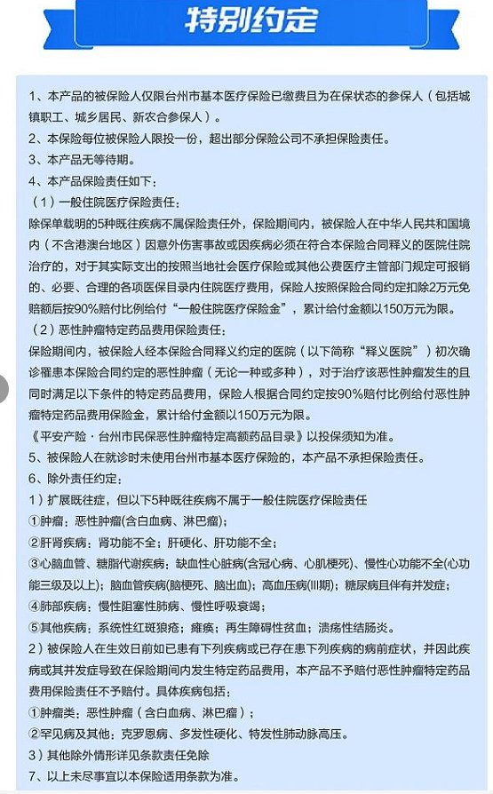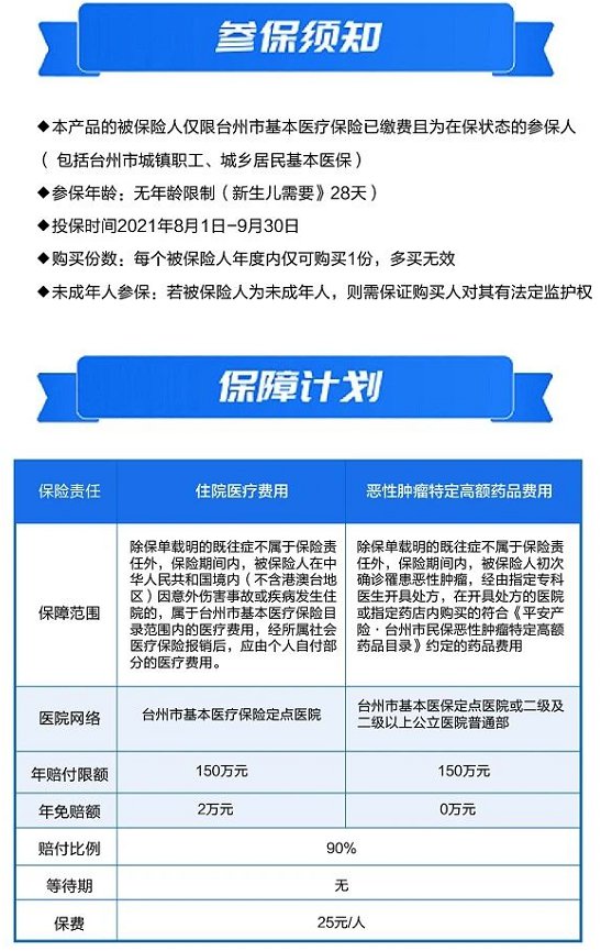 平安产险·台州市民保是专为台州市民定制的普惠型商业补充医疗险,紧密衔接台州基本医疗保险,只要是台州市医保参保人员,无论职工还是居民,不限年龄和职业,保费都是25元,就能享受最高300万元的补充医疗保障。