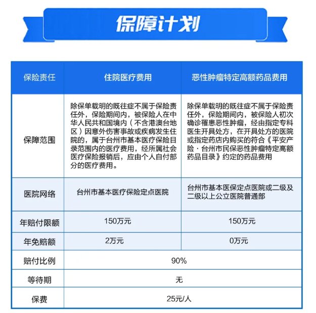 保险期间内,被保险人因意外或疾病发生的住院医疗费用,在台州市医保报销范围内,经医保报销后,在符合保险责任的情况下,超过2万元免赔额后(年累计)按90%比例报销,最高报销150万元。(详见投保页面相关约定)
