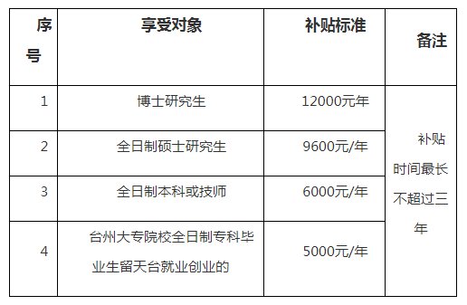 2019年8月1日-2020年7月25日期间(以社保起缴时间为准)到天台非公有制企业(指注册地在天台,在我县依法纳税独立核算的企业单位)工作的博士研究生、全日制硕士研究生、全日制本科或技师以及留天台就业创业的台州大专院校全日制专科毕业生;需与企业签订3年以上劳动(聘用)合同;并在天台缴纳社会保险半年以上;且在我县城区未购房且未享受相关住房优惠政策并租赁住房的。