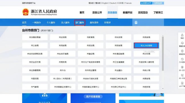 2、点击“部门服务”,选择“市人力社保局”