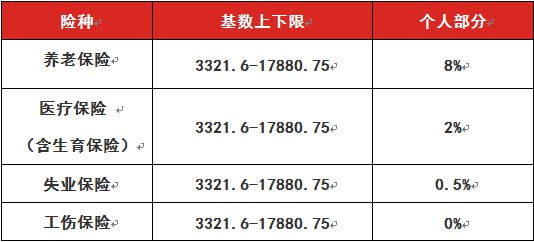 根据最新的社保基数上下限,台州市单位在职职工社保缴费基数、比例为: