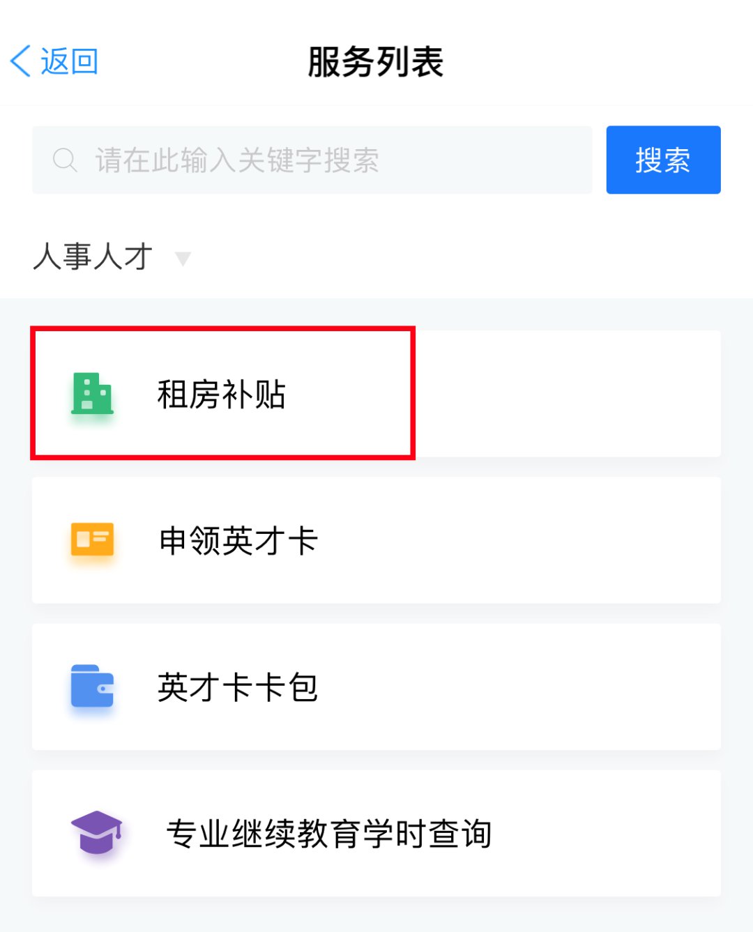 2、找到“服务-人事人才-租房补贴”服务,点击进入服务