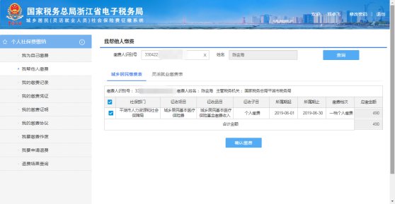 2、点击左侧任务栏【我帮他人缴费】,输入缴费人识别号(一般为身份证号码),点击回车,弹出姓名。点击查询,按自己的参保类别选择城乡居民缴费表或者灵活就业缴费表,显示应缴费信息。勾选信息后,点击【确认缴费】,选择支付宝或者微信(开通中)进行扫码缴费。缴费完成后,弹出支付成功提示,可点击开具缴费凭证。