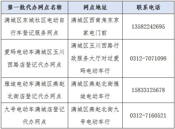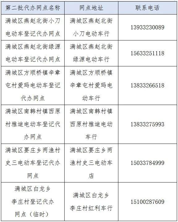 为方便群众就近办理电动自行车登记上牌业务,自2022年5月6日起,满城区启用第二批电动自行车登记上牌代办服务网点,现公布如下: