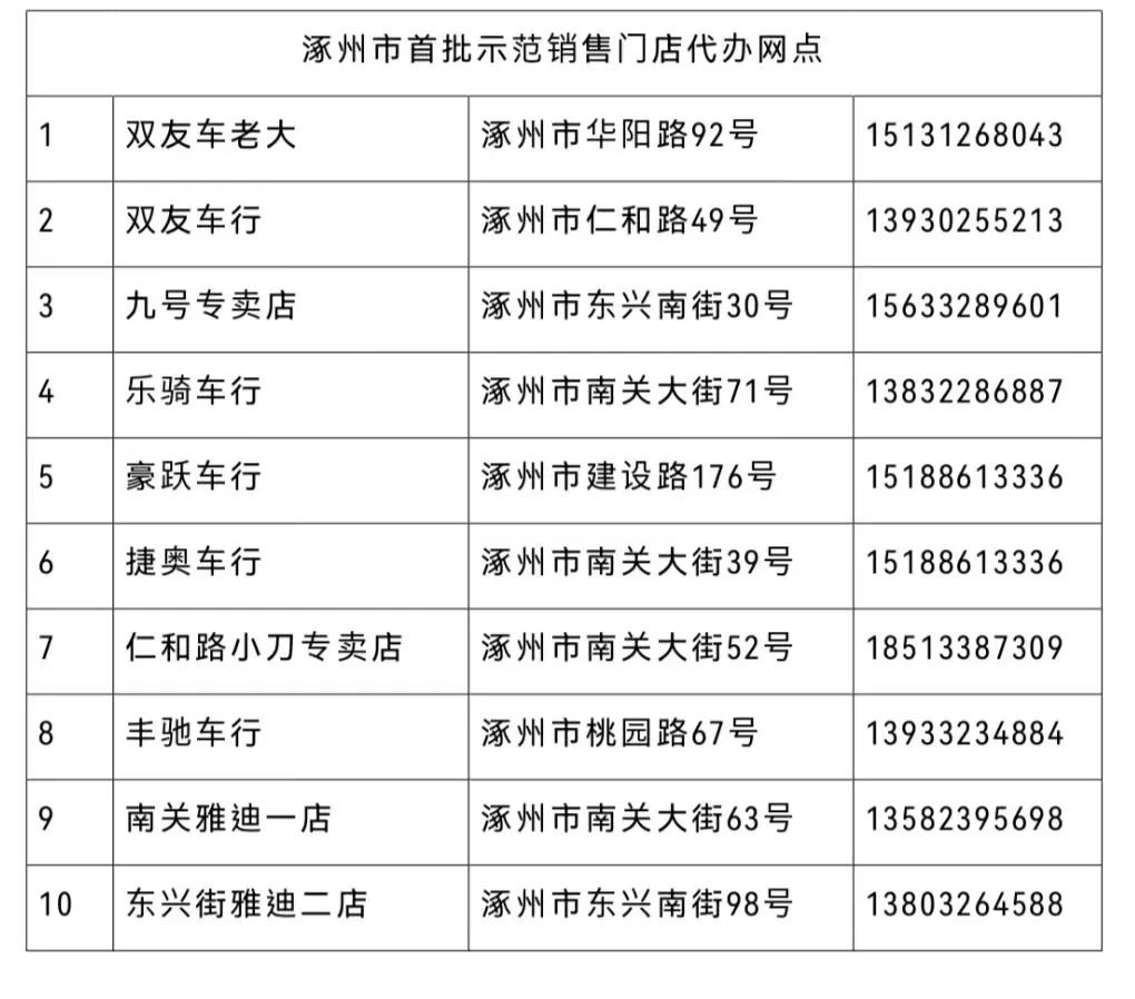 在集中登记上牌初期,为方便群众办理,按照就近办、快捷办的原则,涿州市共设立113个电动自行车登记上牌代办网点,首批示范上牌代办网点信息如下所示(5月1日启动代办),其余社区、乡镇代办网点也将在完善后动态调整开放,您可关注“涿州交警微发布”微信公众号查看公告。