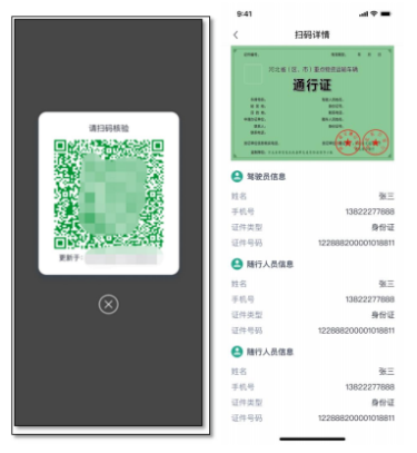 (2〉用户点击“二维码”按钮,可以呼出二维码浮层,点击关闭可关闭浮层。利用微信扫描二维码,可展示出通行证的详情信息。