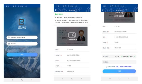 2、首次使用需要点击登录页面右下角“立即注册”,依次输入:姓名、身份证号、密码、手机号(两遍),并勾选《易人社手机APP用户条款》完成用户注册(已注册人员跳过第二步)。